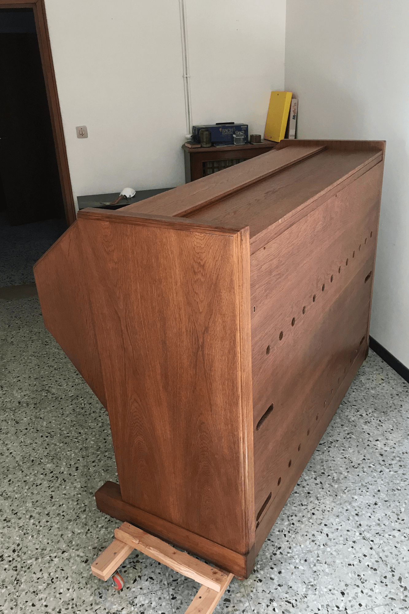 Questo strumento l’ho salvato da un organaro che voleva a tutti i costi disfarsene, per fortuna sono riuscito a salvarlo dalla stufa a legna e con un lento restauro l’ho rimesso a nuovo.