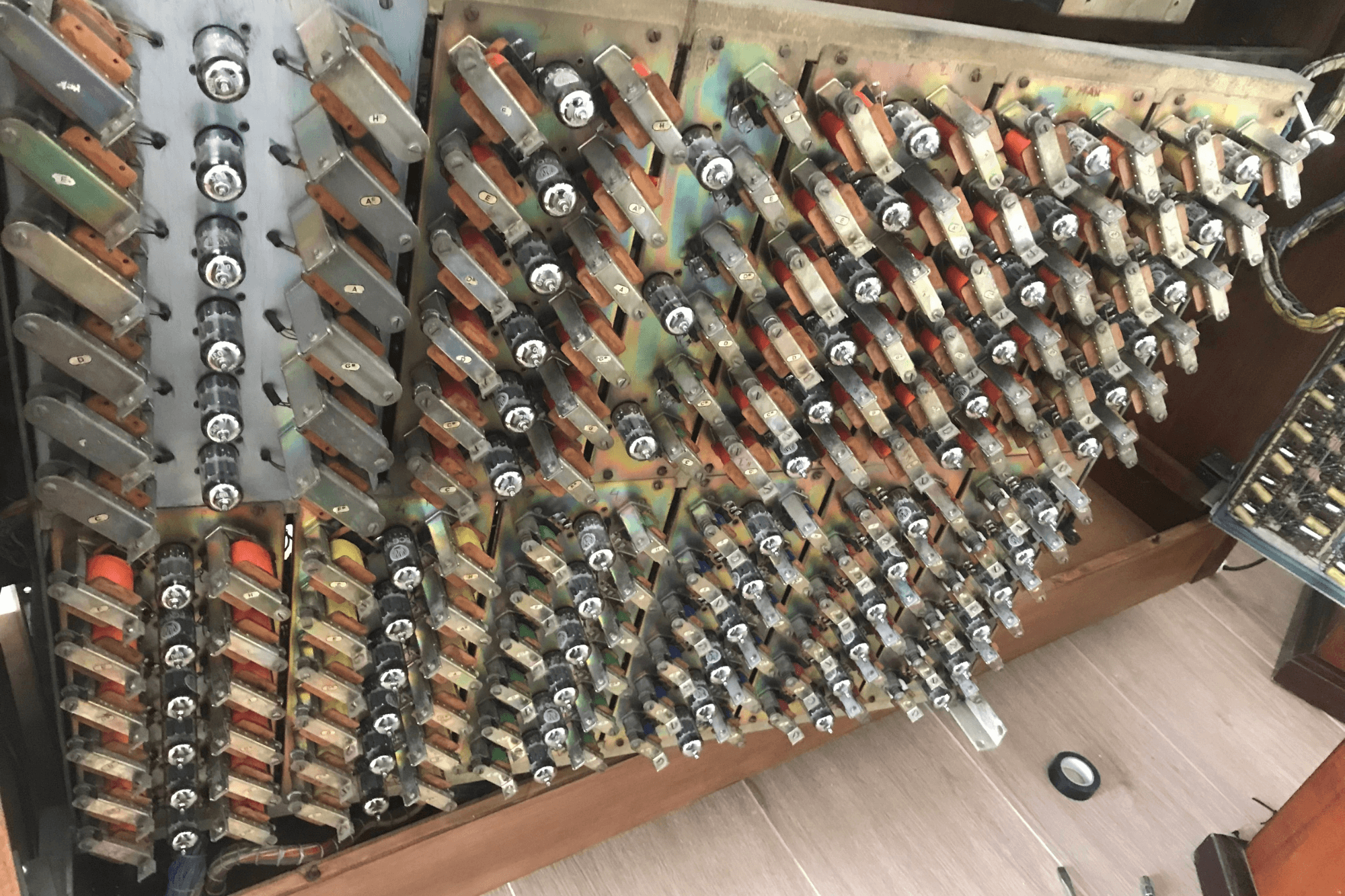 Dentro questo bestione ci sono ben 155 valvole, di cui più di 120 hanno la funzione di generatori di nota, una decina per i filtrati attivi, alcune per la preamplificazione e tre regolatori di tensione a gas.