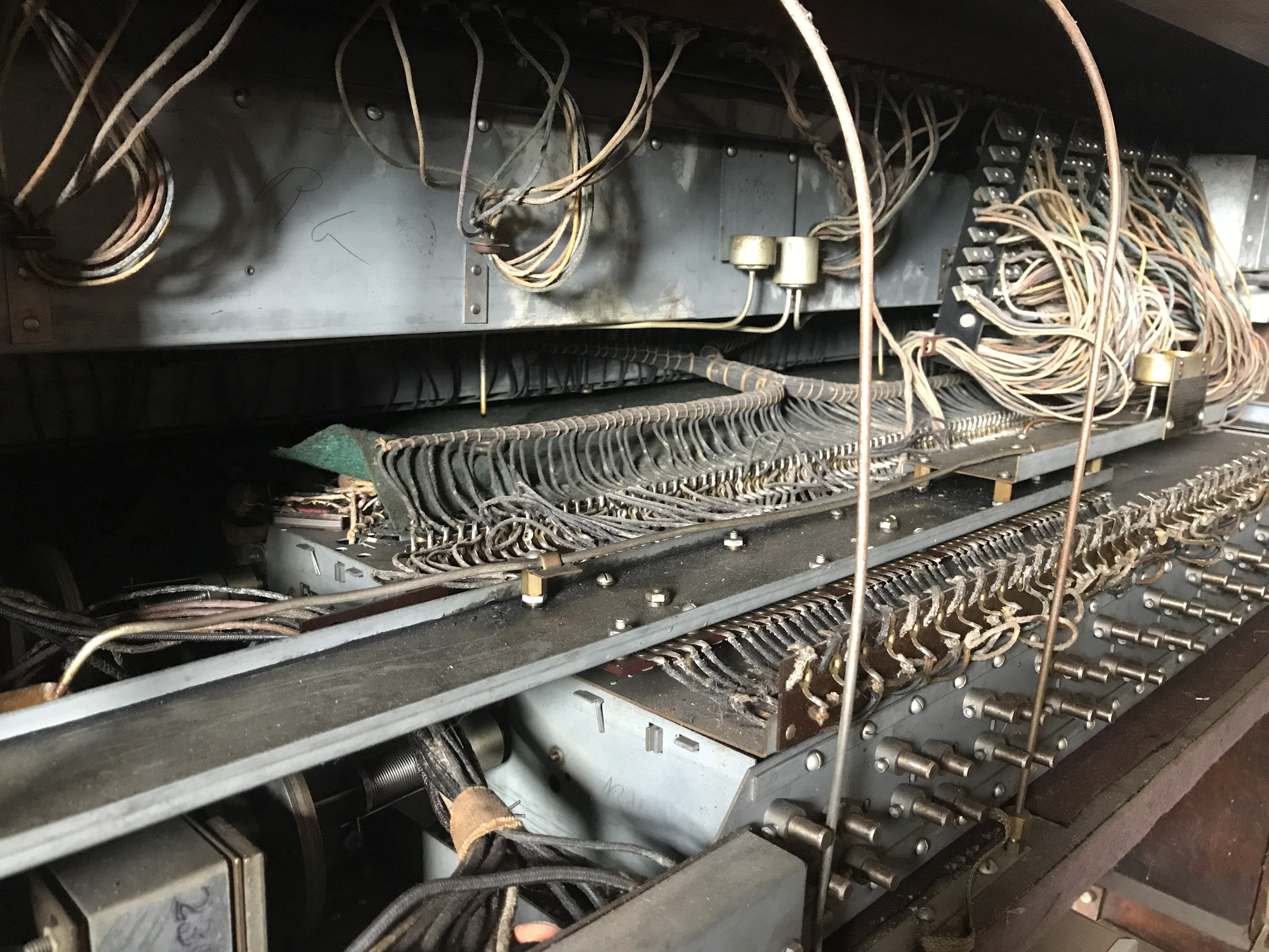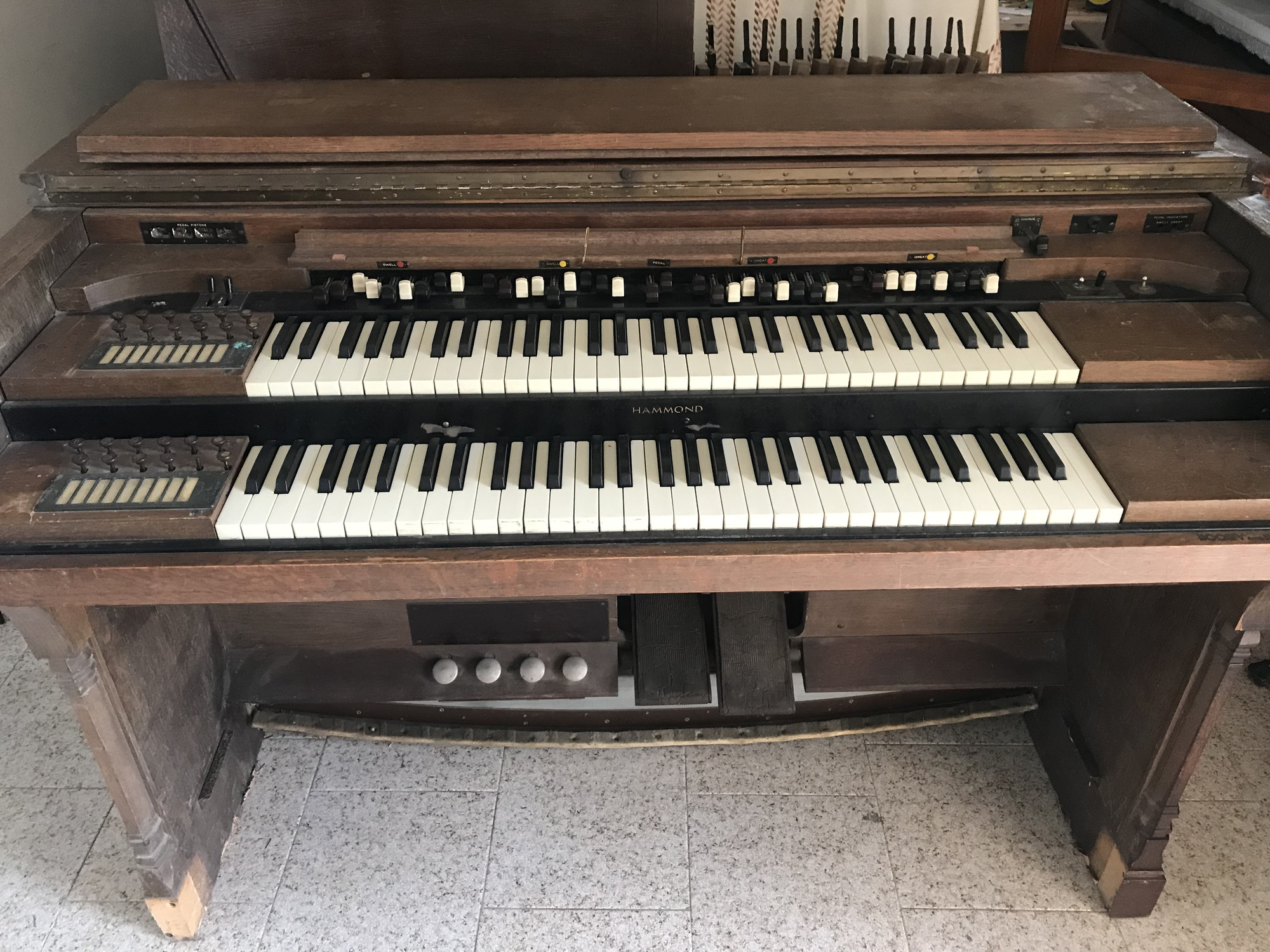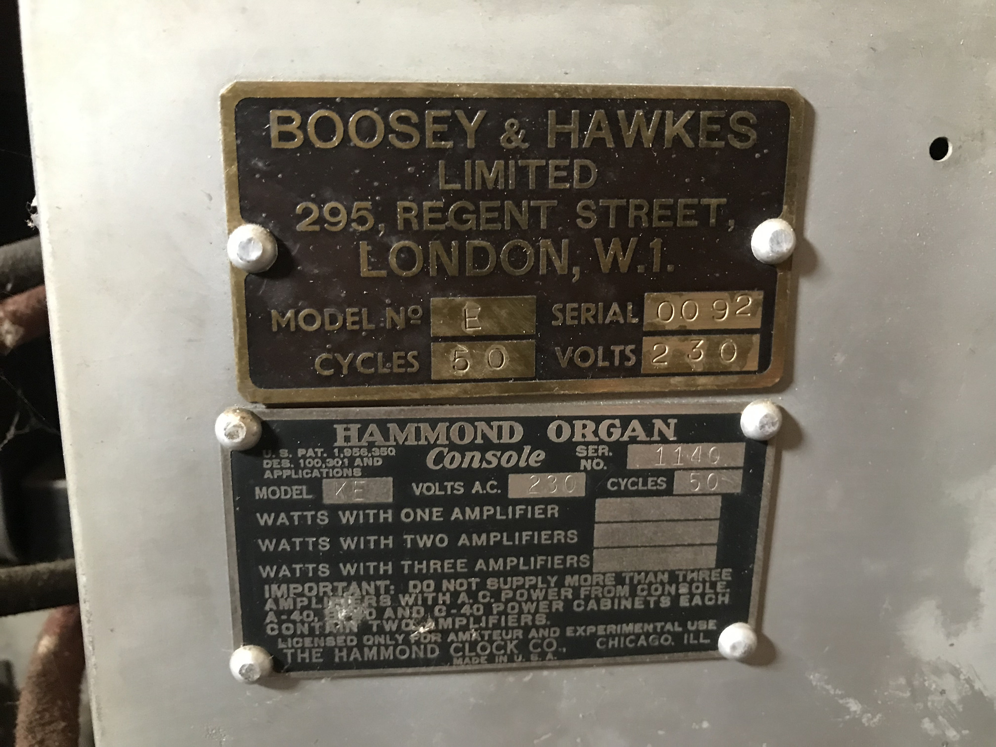 Costruito tra la fine del 1937 e il 1942 l'Hammond model E risultava essere uno dei modelli più costosi dell'epoca. Questo in mio possesso veniva venduto ai magazzini Harrods di Londra per 550 sterline del 1938. La particolarità di questo hammond è di essere nato per l'uso liturgico, quindi unione tasto pedale, pedaliera 32 note e 2 generatori al suo interno, uno dei quali leggermente scordato dal principale per poter simulare il registro battente della voce umana (chorus). Lo strumento che ormai ha quasi 90 anni risulta completo al 95%. Ho provato a dare tensione ai generatori e i motori girano liberamente. Si prospetta un lungo restauro che dovrà essere minuzioso e meno invasivo possibile vista la rarità dello strumento