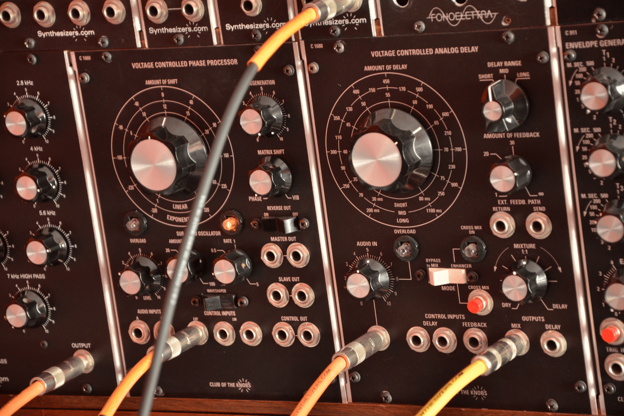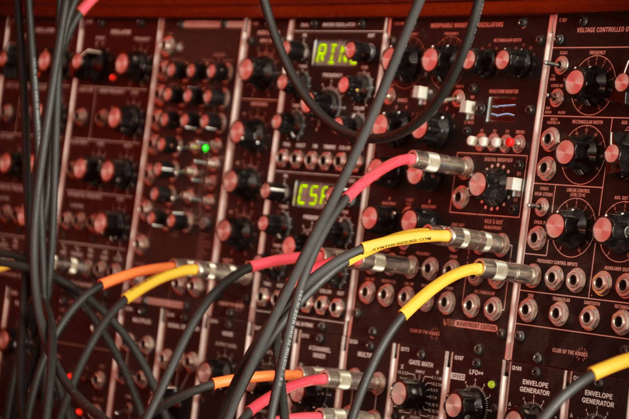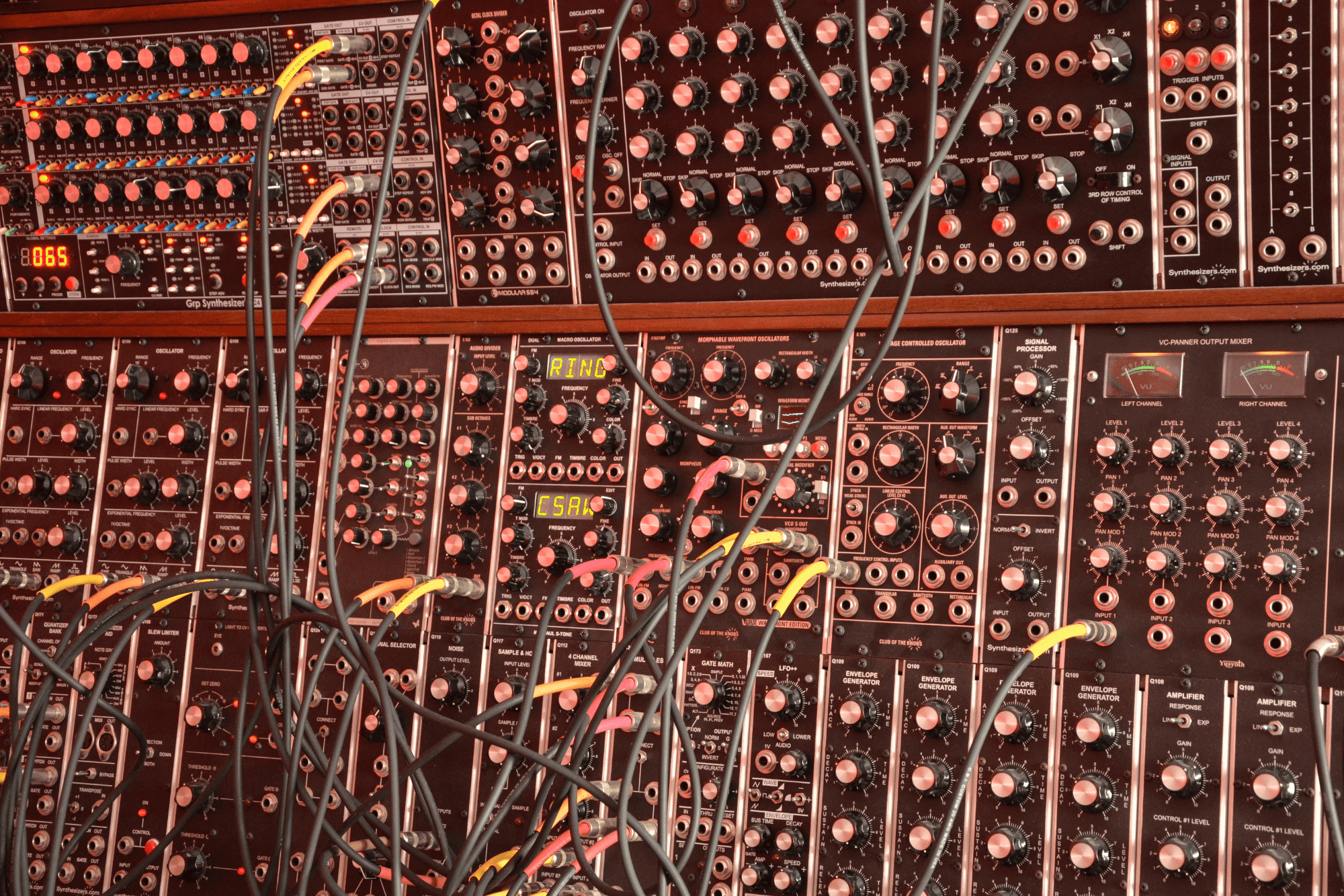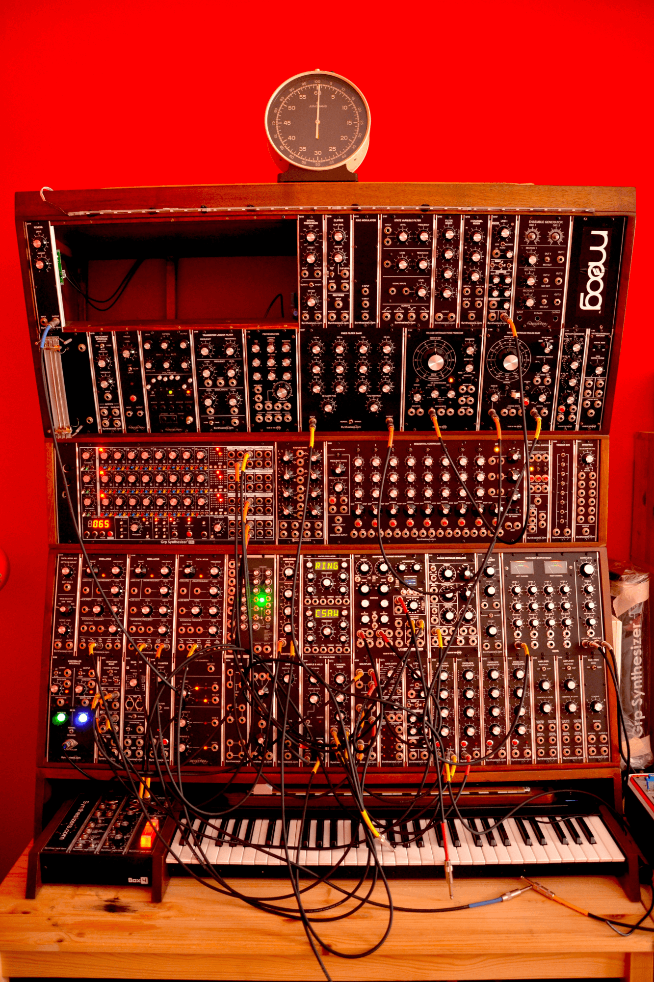 Ecco uno dei miei strumenti preferiti, si tratta di un modulare formato 5U costruito una base di moduli della synthesizers.com e poi ampliato con moduli di vari produttori, da Club of the knobs a GRP e alcuni moduli costruiti da me come le molle “a vista”, da poter suonare percuotendole, ai pedali Moog Murf e Electro Harmonix Freeze trasformati in moduli formato modulare.